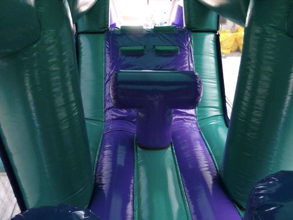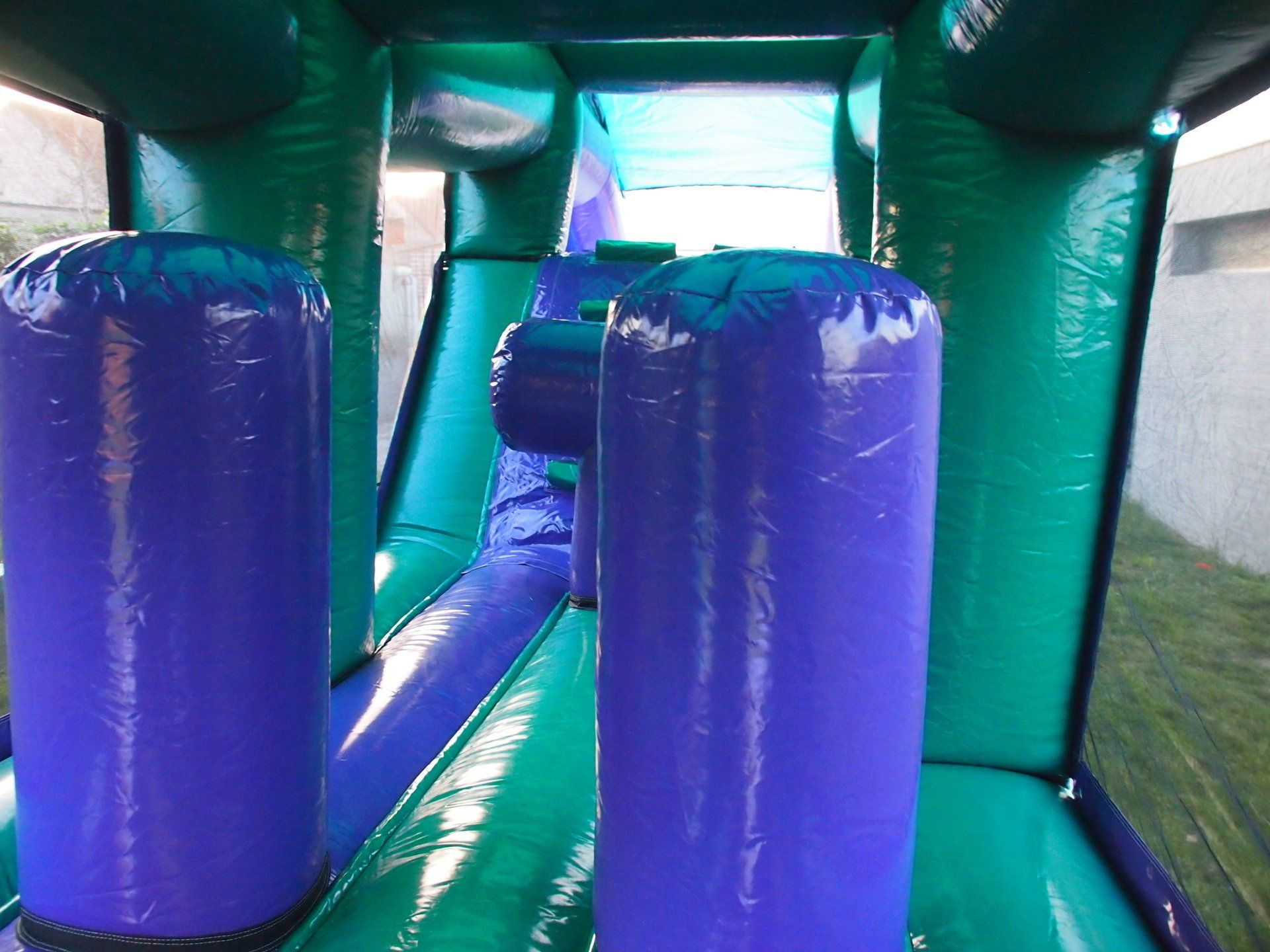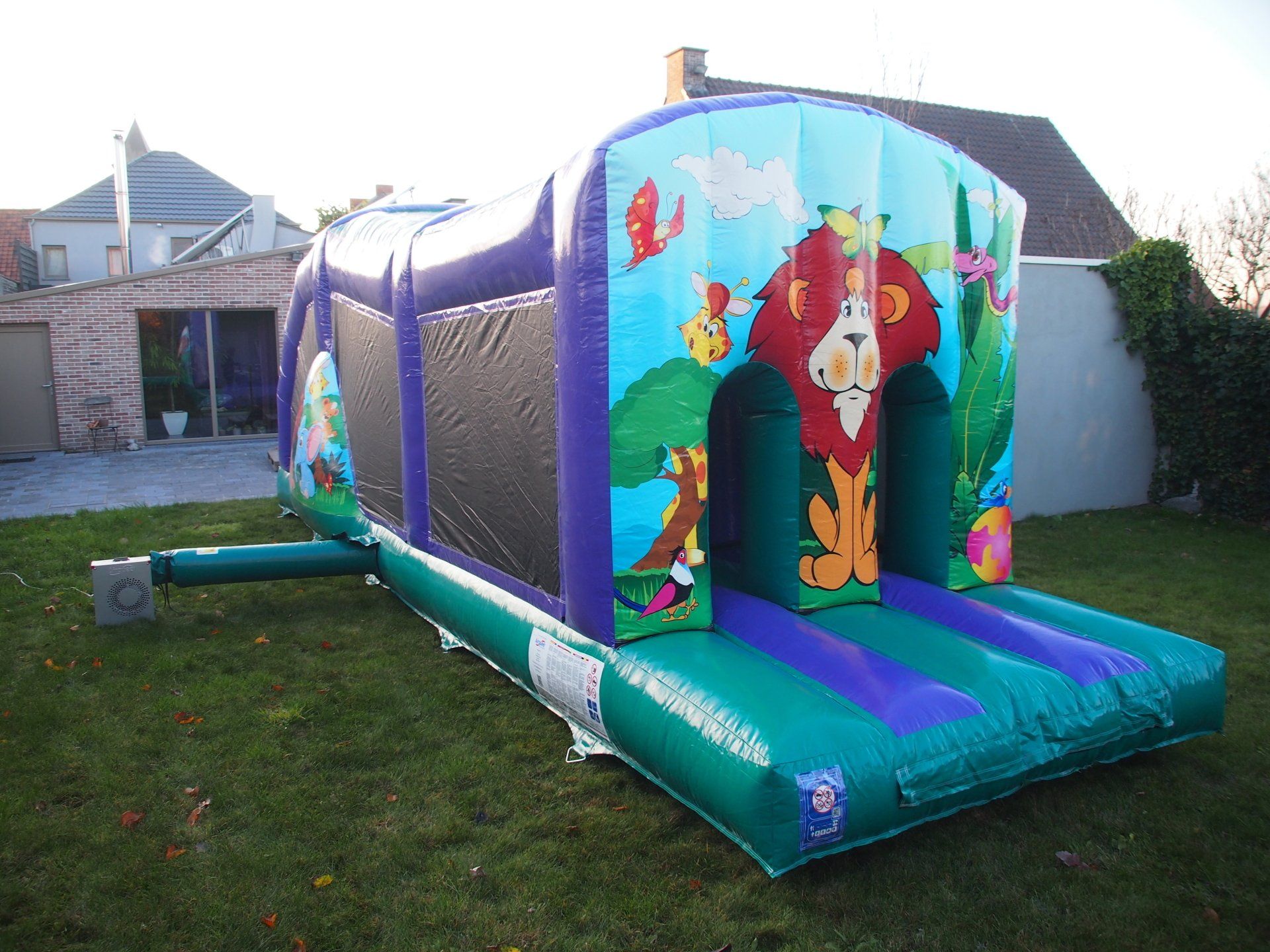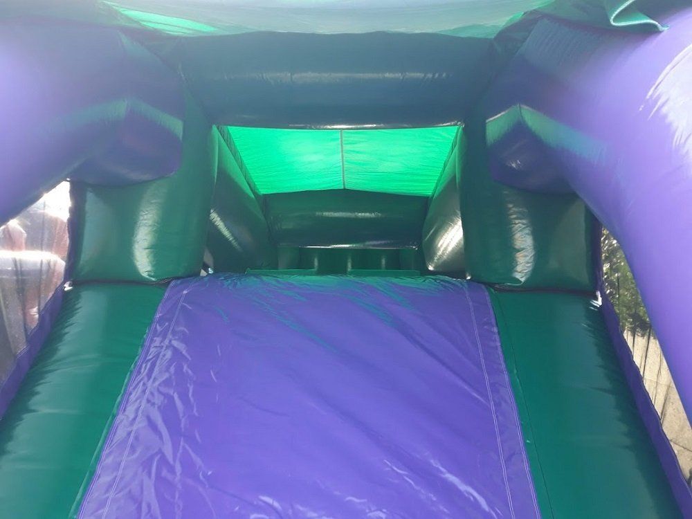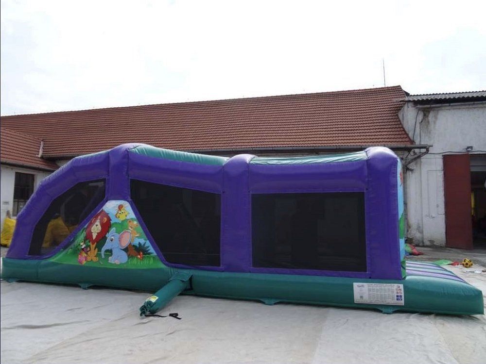 Een supertof hindernissenparcours dat eindigt op de glijbaan. Springkasteel en sportattractie in één! Bovendien superveilig: overdekt en met netten omheind.